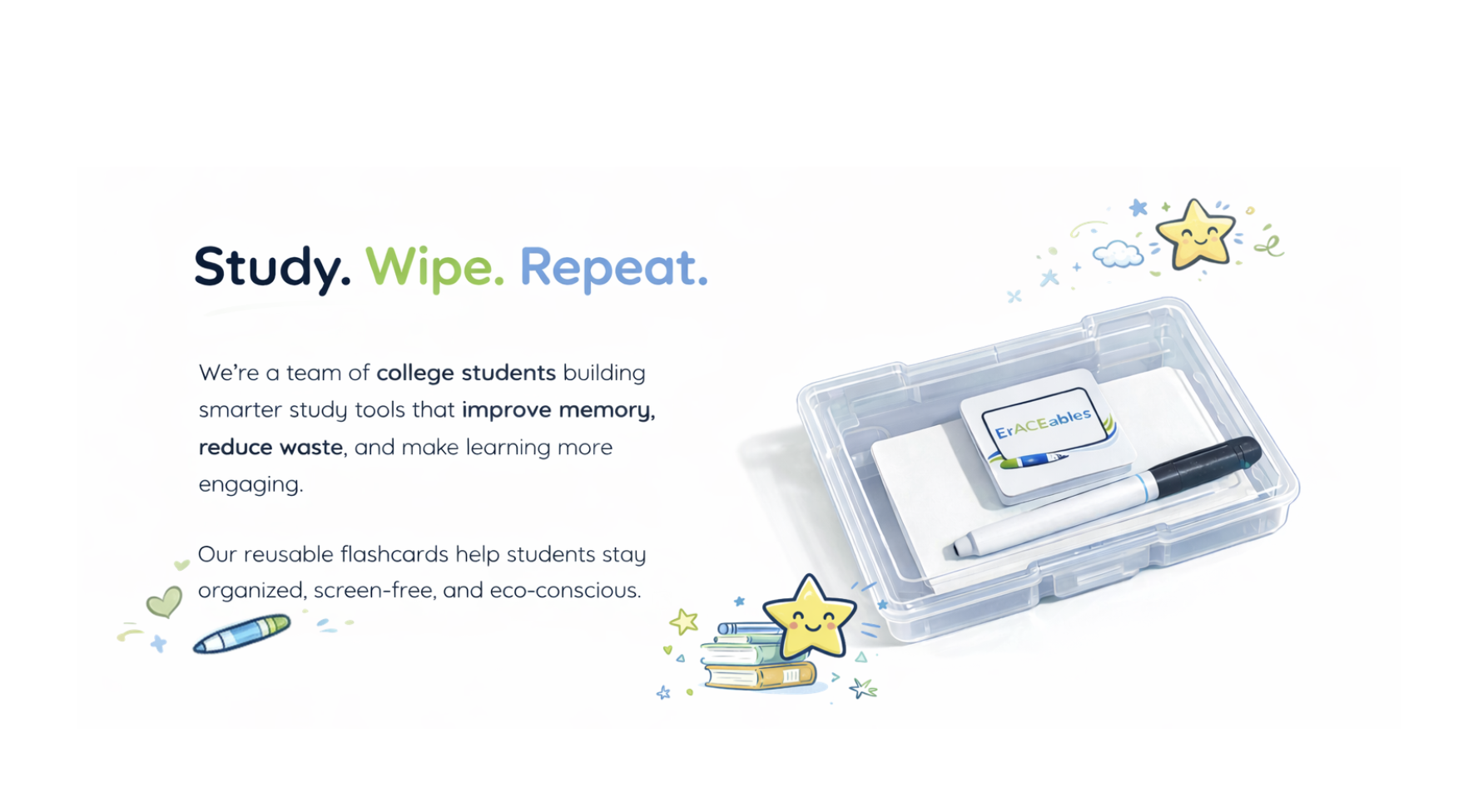 A reusable flashcard study kit that lets students study, wipe, and repeat, making studying more interactive, efficient, and sustainable